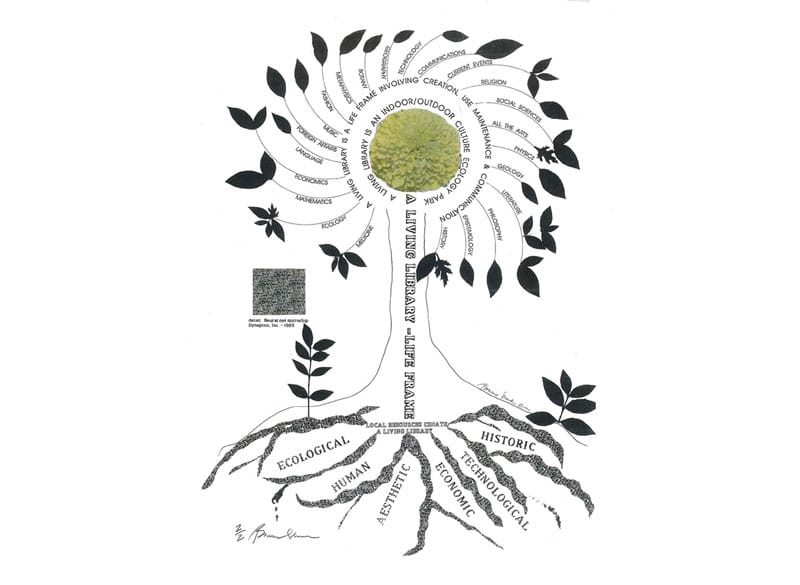 Bonnie Ora Sherk (b. May 18, 1945, New Bedford, MA – d. August 8, 2021, San Francisco) was a visionary artist, landscape architect, and environmental educator. Her multidisciplinary work explored interdependent relationships between humans, animals, and nature. Sherk founded The Farm, situated under a freeway interchange in San Francisco, which she directed from 1974 to 1980. In 1981, Sherk founded Life Frames, Inc., supporting her nonprofit educational work A Living Library (ALL). Currently, active locations of ALL projects are on Roosevelt Island, NYC (2001-present), and in San Francisco at the Bernal Heights Living Library & Think Park Nature Walk (2002-present) and OMI/Excelsior Living Library & Think Park (1998-present).