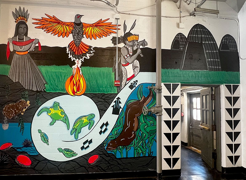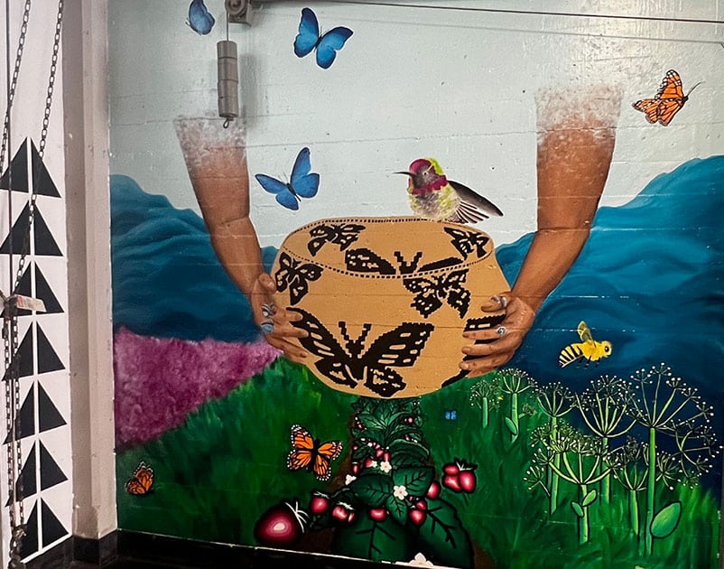 The American Indian Cultural District (AICD), with support from Fort Mason Center For Arts & Culture (FMCAC), presents new mural commissions by artists Brittany Burrows and Jewelina Acosta. Depicting vegetation and wildlife from the land and water, the artists highlight the importance of Indigenous knowledge and traditional practices in maintaining ecological balance and human well-being. By recognizing the interconnectedness of all life forms and the importance of preserving biodiversity, their work points to a more harmonious and sustainable future for generations to come.